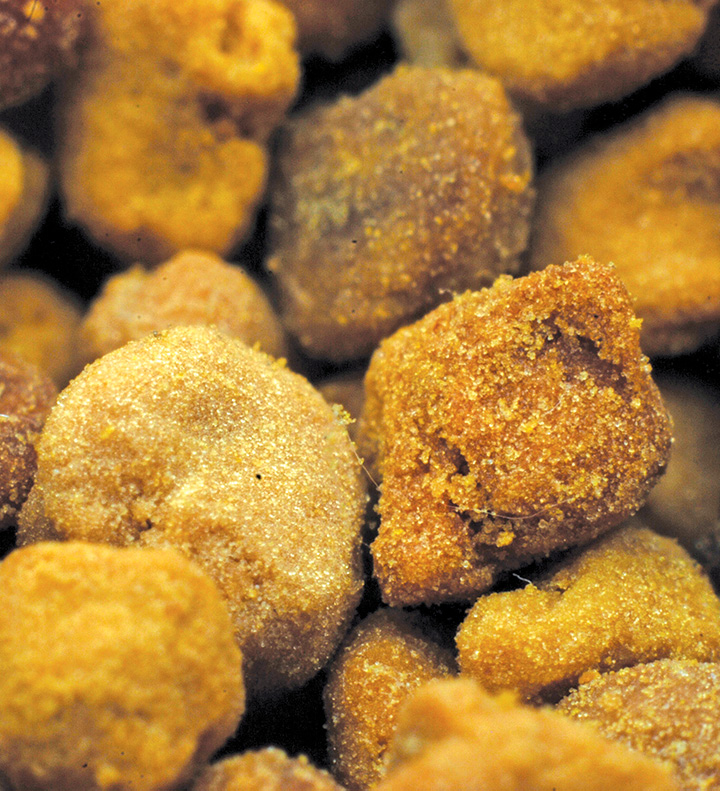 Przeciętna wielkość ziaren pyłku waha się od 5 µm do 200 µm. Przykładowo, najmniejsze ziarna wykształca niezapominajka (poniżej 10 μm), a jedne z większych dynia (100-200 µm) lub dziwaczek (powyżej 200 µm). Gdy ziarna są zbyt duże, pszczołom trudno jest uformować obnóża, w związku z czym nie zbierają go wcale lub robią to niechętnie. Z kolei z ziaren pyłku roślin wiatropylnych (leszczyna, olsza, trawy), które są drobne, lekkie, bez kitu pyłkowego na powierzchni, także dosyć trudno formowane są obnóża. Niemniej na przednówku (np. wczesna wiosna), z braku lepszego źródła białka pszczoły przynoszą do ula także pyłek roślin wiatropylnych. Ziarna niektórych gatunków roślin są gładkie, inne mają siateczkowatą (np. wierzba) lub prążkowaną (np. klon jesionolistny) powierzchnię, jeszcze inne cechuje obecność kolców (np. przedstawiciele rodziny astrowatych). Ciekawostką jest fakt, że zbieraczki rozróżniają gatunek rośliny na podstawie zapachu pyłku. Obnóża przetransportowane do ula składane są w komórkach plastra, ubijane oraz przelewane warstwami miodu. W ten sposób powstaje z pyłku kiszonka (w warunkach beztlenowych zachodzi fermentacja mlekowa), czyli pierzga, którą pszczoły się odżywiają. Pokarm ten jest szczególnie cenny, gdyż służy do karmienia starszych larw - stwierdzono, że na wykarmienie jednej larwy robotnicy potrzeba około 150 mg pyłku. DDzięki u młodych robotnic wykształcają się gruczoły gardzielowe odpowiedzialne za produkcję mleczka pszczelego, a u starszych decyduje o intensywnym wypacaniu wosku oraz powstawaniu ciała białkowo-tłuszczowego (szczególnie rozwiniętego u pszczół zimujących).
