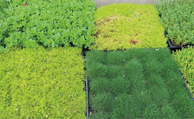 babka średnia Plantago media, czyściec wełnisty Stachys byzantina, jastrzębiec kosmaczek Hieracium pilosella, komonica zwyczajna Lotus corniculatus, koniczyna polna Trifolium arvense, macierzanka omszona Thymus lanuginosus, macierzanka piaskowa T. serpyllum, rozchodnik ostry Sedum acre, rozchodnik sześciorzędowy S. sexangulare, smagliczka skalna Aurinia saxatilis, (rogownica kutnerowata Cerastium tomentosum, rdest ptasi Polygonum aviculare).