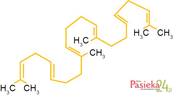 Związki triterpenowe, w tym skwalen (Ilustr. 15), występują w propolisie [10] i na tej drodze trafiają do wosku pszczelego. Skwalen wzbogaca naturalny płaszcz lipidowy tkanki skórnej. Jest dobrze wchłaniany przez skórę, zapobiega jej wysuszeniu, a także powstawaniu rozstępów skórnych [7].