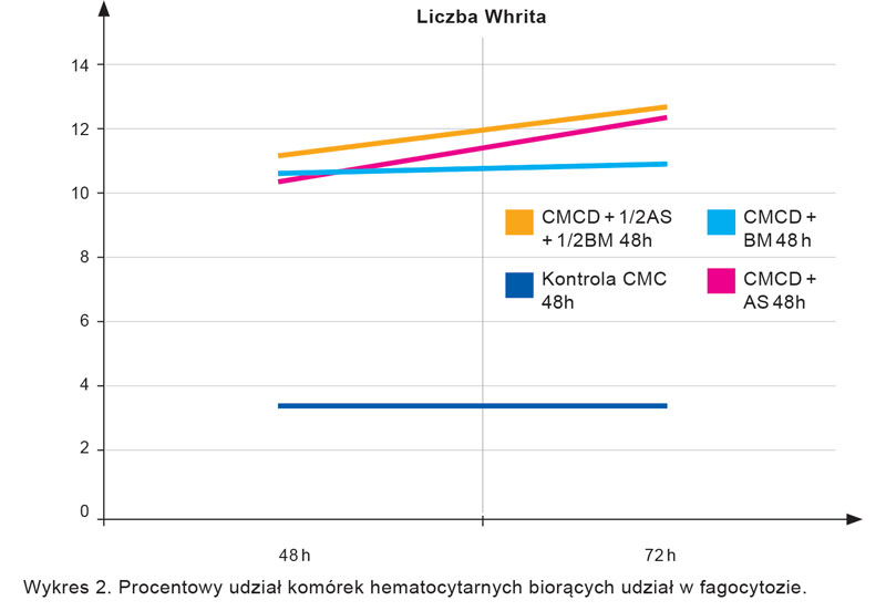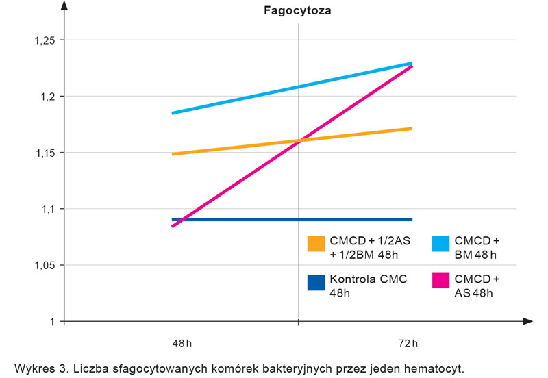 Wzrost odporności pszczół na chorobotwórcze bakterie uzasadniają wyniki oceny wskaźników aktywności ich systemu immunologicznego (wykresy 2. i 3.). W hemolimfie robotnic żywionych ciastami drożdżowymi obserwowano 4-4,5-krotnie wyższy odsetek komórek fagocytujących.