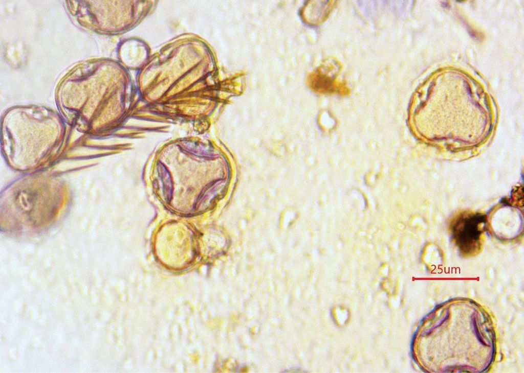 Obraz pyłkowy polskiego miodu lipowego (udział pyłku lipy – więcej niż 20%). Ziarna pyłku lipy mają trójkątny kształt z trzema wypustkami w głąb intyny. Po lewej włosek pszczoły. Zdjęcie wykonano przy powiększeniu 100x. Fot. Marta Burzyńska