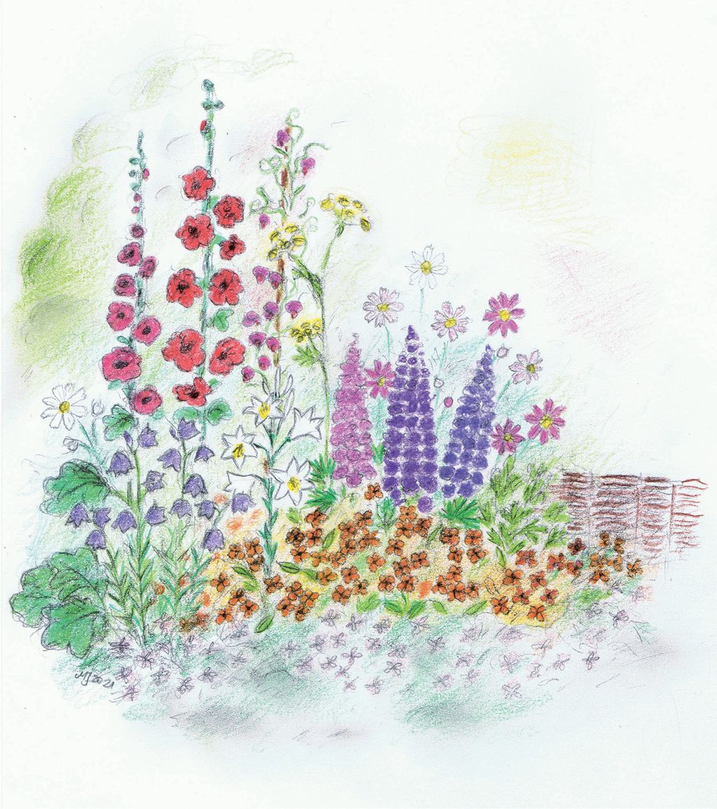 Zielne, krzewinki: aksamitka Tagetes sp. div., aster chiński Callistephus chinensis, michałki lub marcinki, czyli aster nowoangielski Aster novae-angliae i aster nowobelgijski A. novae-belgiae, barwinek pospolity Vinca minor, bratek ogrodowy Viola ×wittrockiana, bylica boże drzewko Artemisia abrotanum, bylica piołun Artemisia absinthium, chryzantema ogrodowa Dendranthema ×hortorum, cynia wytworna Zinnia elegans, czyściec wełnisty Stachys byzantina, dalia ogrodowa (georginia) Dahlia hybrida, dziewanna ogrodowa Verbascum hybridum, dzwonek brzoskwiniolistny Campanula persicifolia, dzwonek ogrodowy C. medium, fiołek wonny Viola odorata, floks wiechowaty Phlox paniculata, gipsówka wiechowata Gypsophila paniculata, goździk brodaty Dianthus barbatus subsp. barbatus, groszek pachnący Lathyrus odoratus, kosaciec amerykański Iris versicolor, kosaciec niemiecki Iris germanic, jastrun wielki Leucanthemum maximum, kocanki ogrodowe (nieśmiertelnik) Xerochrysum bracteatum, konwalia majowa Convallaria majalis, kosmos podwójnie pierzasty (onętek) Cosmos bipinnatus, lak ogrodowy Erysimum cheiri, lewkonia letnia Matthiola incana, lilia biała (św. Józefa) Lilium candidum, lilia tygrysia L. lancifolium, liliowiec ogrodowy Hemerocallis ×hybrida, liliowiec rdzawy H. fulva, lubczyk ogrodowy Levisticum officinale, łubin ogrodowy Lupinus polyphyllus, maciejka dwuroga Matthiola bicornis, mak Papaver sp. div., malwa ogrodowa Alcea rosea, melisa lekarska Melissa officinalis, mięta pieprzowa Mentha ×piperita, mieczyk ogrodowy (gladiola) Gladiolus ×hybridus, mydlnica lekarska Saponaria officinalis, nagietek lekarski Calendula officinalis, naparstnica purpurowa Digitalis purpurea, narcyz trąbkowy Narcissus pseudonarcissus, narcyz wonny N. poeticus, nasturcja większa Tropaeolum majus, nawłoć ogrodowa Solidago hybryda, orlik mieszańcowy Aquilegia ×hybrida, ostróżeczka ogrodowa Consolida ajacis, ostróżka wyniosła Delphinium elatum, piwonia chińska Paeonia lactiflora, piwonia lekarska P. officinalis, prawoślaz lekarski Althaea officinalis, rabarbar kędzierzawy Rheum rhabarbarum, rezeda pachnąca Reseda odorata, róża (róże pnące np. ‘New Dawn’, róże krzaczaste) Rosa, rudbekia naga ‘Golden Glow’, Rudbeckia laciniata ‘Golden Glow’ – wysoka, pełne, żółte kwiatostany, rudbekia (różne gatunki) R. sp. div., ruta zwyczajna Ruta graveolens, słonecznik zwyczajny Helianthus annuus, stokrotka Bellis perennis odmiany z gr. Tubulosa, suchlin różowy (suchołuska) Helipterum roseum, szafirek drobnokwiatowy Muscari botrioides, szparag lekarski Asparagus officinalis, ślazówka ogrodowa Lavatera trimestris, tojad mocny Aconitum firmum, truskawka Fragaria ×ananassa, tulipan Tulipa sp., tymianek właściwy Thymus vulgaris, wieczornik damski Hesperis matronalis, wrotycz maruna Tanacetum parthenium, wyżlin większy (lwia paszcza) Antirrhinum majus.
