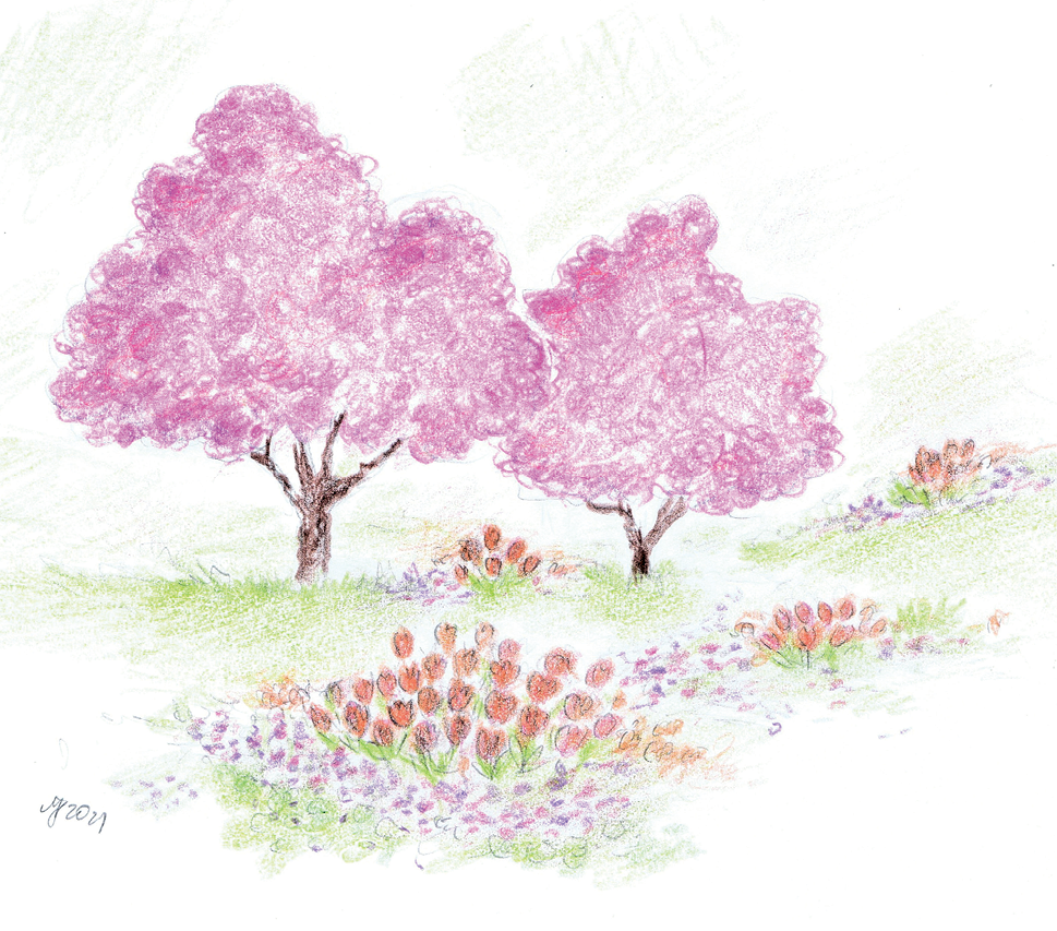 Ryc. 2. Jabłonie ozdobne – kompozycja z tulipanami i fiołkami.