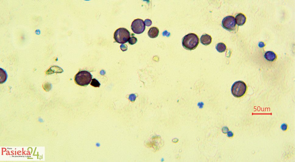 Fot. 5. Typowy osad miodowy miodu gryczanego. Zdjęcie mikroskopowe przy powiększeniu 10×. Preparat barwiony.