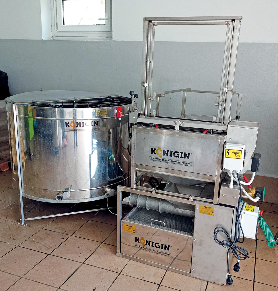 Przed sezonem 2021 zdecydowałem się zintegrować niektóre urządzenia w jedną minilinię do pozyskiwania miodu. Nogi od mojej półautomatycznej odsklepiarki zostały wycięte i zainstalowano ją na prasie do odsklepin o wydajności 50 kg/h. Pod nią z kolei znajduje się trzykomorowy podgrzewany zbiornik filtracyjny, przez który przepływa odzyskany z odklepin miód wraz z tym z miodarki, a następnie kierowany jest do beczek. Dzięki takiemu procesowi technologicznemu ostrza odsklepiarki z reguły ustawiam tak, by głęboko wchodziły w plaster. Same plastry są z kolei pogrubiane przez pszczoły, gdyż ułożone są za pomocą grzebienia po 9 w 10-ramkowych korpusach miodni.