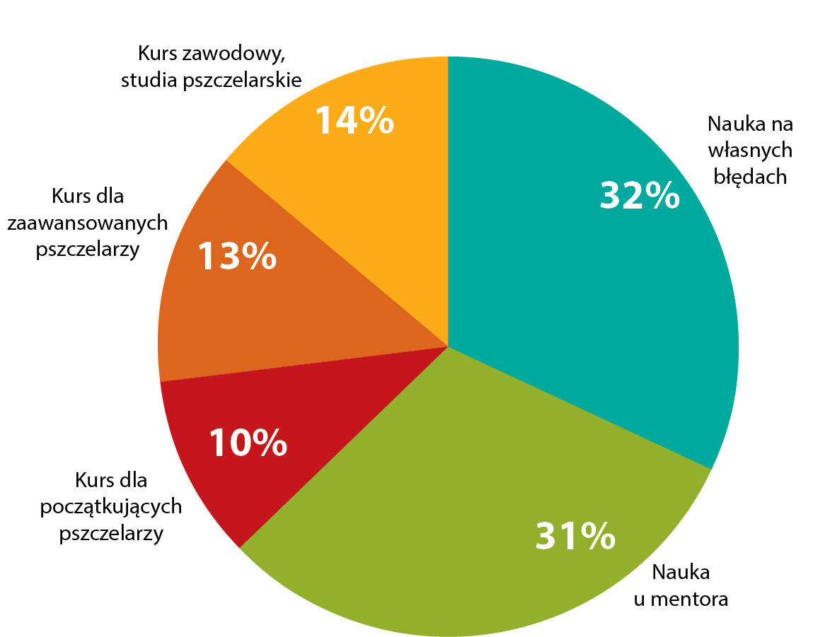 Z pytania o wykształcenie kierunkowe wynika, że niemalże 2/3 respondentów nie ma udokumentowanej wiedzy pszczelarskiej. Trzydzieści dwa procent badanych uczy się samodzielnie a 31% u doświadczonego pszczelarza (wykres 2). W ankietach z całego świata najczęściej udzielana odpowiedź to „kurs podstawowy pszczelarski”. Sześćdziesiąt pięć procent polskich ankietowanych korzystała z pomocy doświadczonego pszczelarza w pierwszych latach posiadania pszczół.