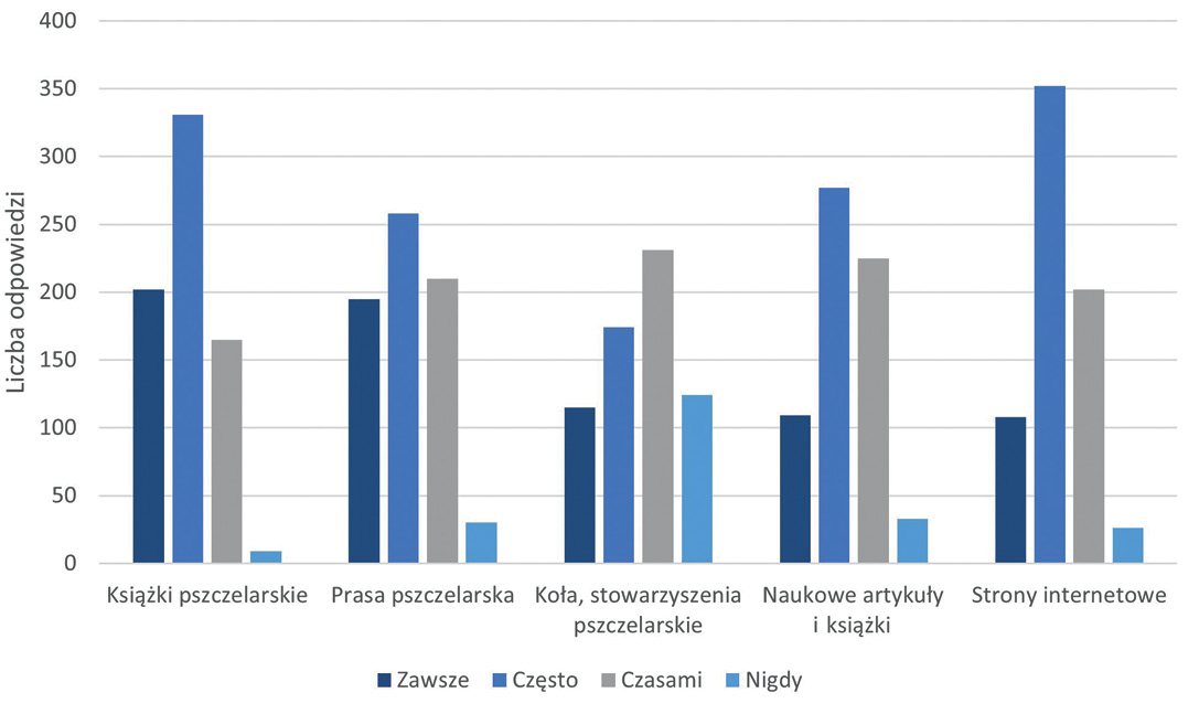 Na pytanie o to, jak pszczelarze zdobywają wiedzę, pierwsze miejsce w kategorii „zawsze” zajęły książki pszczelarskie. Na kolejnych miejscach uplasowały się prasa pszczelarska i koła pszczelarskie. Nieco zaskakuje popularność internetu – okazało się, że tylko 108 badanych sięga po niego zawsze, a 352 badanych często w celu zdobycia informacji (wykres 3).