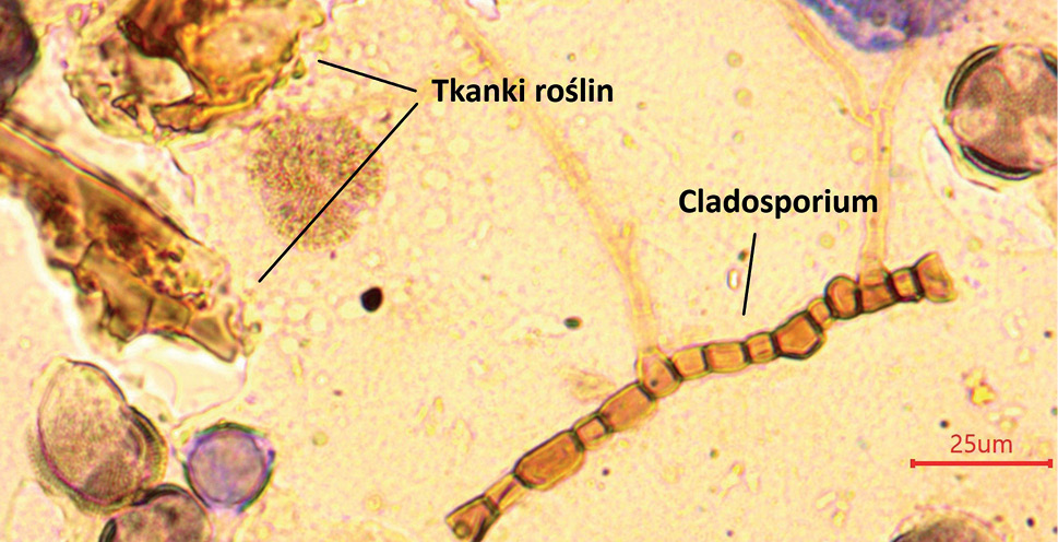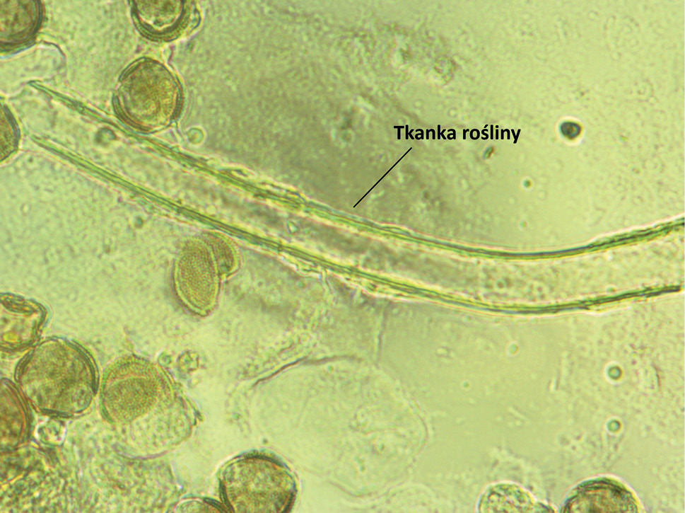 Fot. 2. Obraz mikroskopowy osadu miodu spadziowego z charakterystycznymi oznakami spadzi, obecne liczne części tkanek roślinnych oraz duży zarodnik grzybów pleśniowych z rodzaju Cladosporium. Fot. Marta Burzyńska