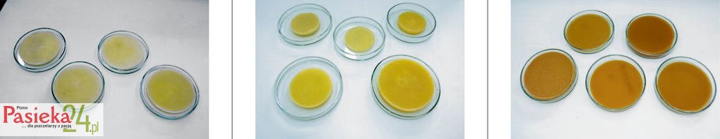 Pozwolicie Państwo, że odniosę się tylko do pierwszej części tego zapisu. Nie ulega wątpliwości, że obce substancje w wosku, takie jak parafina są niedozwolone i należy je traktować jako zafałszowanie. Jednak identyfikacja tych zafałszowań na podstawie „obcego zapachu, barwy, nieswoistej konsystencji” w odniesieniu do większości próbek wosku czy węzy, które badałam (nawet z dodatkiem 50% parafiny), jest bardzo trudna, a wręcz niemożliwa. Metody oparte na ocenie organoleptycznej mają charakter orientacyjny i nie pozwalają w sposób jednoznaczny wykluczyć bądź potwierdzić zafałszowanie wosku.