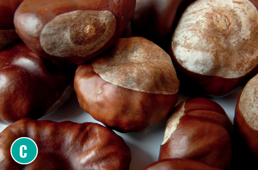 Fot. 2. Kasztanowiec zwyczajny: A – liść, B – kwiat, C – nasiona.