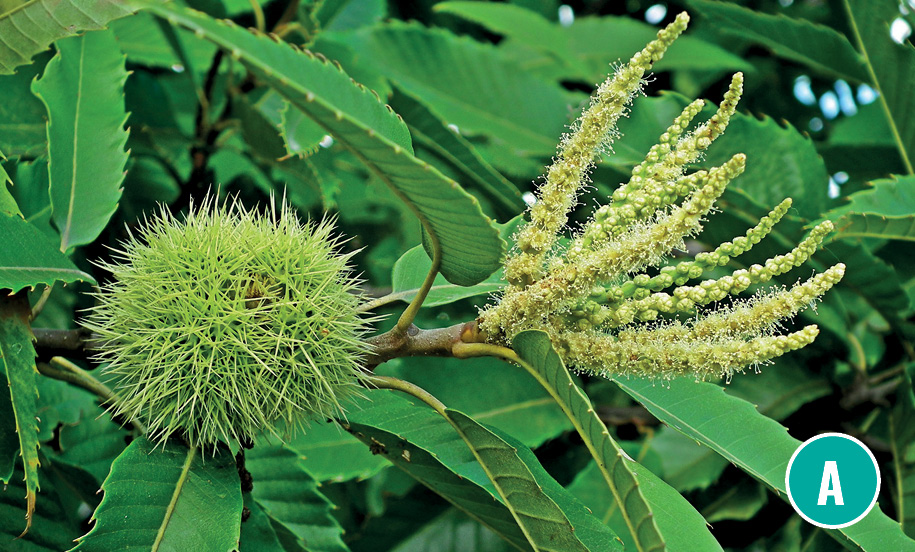 Kasztan jadalny: A – widoczne kwiaty, liście i owoce, B – nasiona.