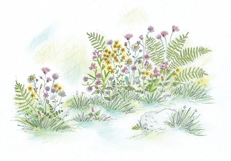 Obok gatunków pyłko- i nektarodajnych w zaproponowane układy warto wkomponować inne rośliny obserwowane w okolicznych zbiorowiskach, tak by ogrodowe aranżacje jeszcze bardziej nawiązywały do roślinności w sąsiedztwie pasieki i wspierały lokalne ekosystemy. Będą to trawy, turzyce, kosmatki, skrzypy i mszaki, a także inne, niewymienione wyżej, rośliny dostarczające pokarmu owadom zapylającym. Jest to ważne, zwłaszcza gdy np. łąka czy brzeg lasu w obrębie działki jest kontynuacją zbiorowiska „poza ogrodzeniem”. W takim przypadku część roślin będzie obecna tu od początku, inne zaś pojawią się spontanicznie. Wśród nich mogą być też rośliny objęte ochroną prawną, jak np. goryczka trojeściowa.