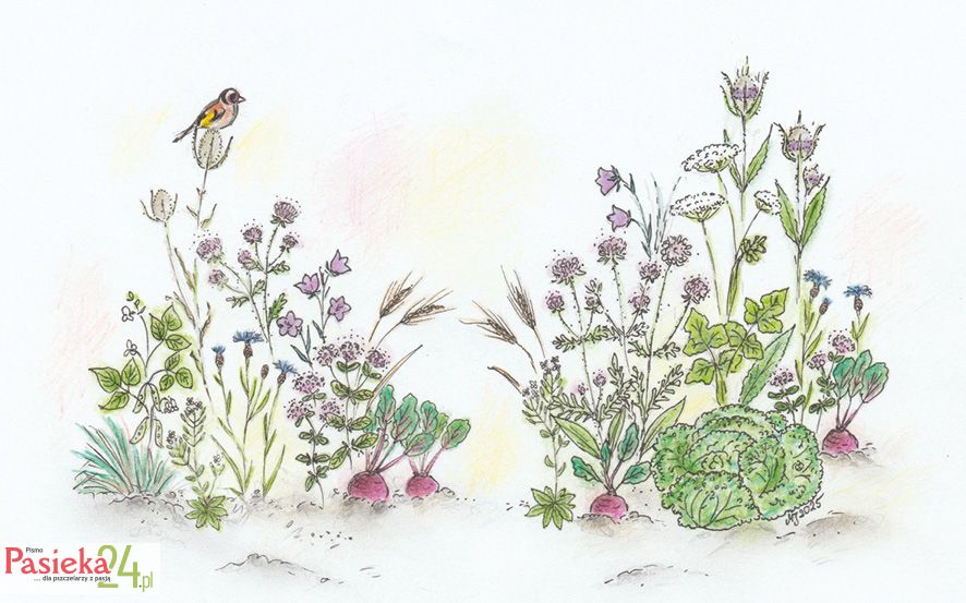 Dobór roślin: świerzbnica polna, barszcz zwyczajny, lebiodka pospolita, dzwonek brzoskwiniolistny, rzodkiewnik pospolity, szczeć pospolita, chaber bławatek, pszenica samopsza, kapusta głowiasta włoska, burak zwyczajny, fasola (np. polska fasola z orzełkiem).