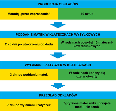 Na przykładzie z 2010 roku chcielibyśmy przedstawić nieco inne spojrzenie na niszczenie mateczników, które zawsze wiąże się z pewnym nakładem pracy pszczelarza. Wykonywanie odkładów na ramce Dadanta rozpoczęto po ostatnim miodobraniu w III dekadzie lipca metodą „przez zaproszenie”. Polega ona na pozyskaniu z rodziny 2-3 ramek z czerwiem w różnym stadium rozwoju i 2 ramek z pokarmem, które po strząśnięciu pszczół, umieszcza się w oddzielnym korpusie. Następnie korpus ustawiamy na gniazdo oddzielone kratą odgrodową, tak by przeszły do niego młode pszczoły – mające mocny instynkt opieki nad nowym pokoleniem. Przed wieczorem zabieramy korpus i odstawiamy w inne miejsce na pasieczysku lub wywozimy. Metoda ta sprawia, że w odkładzie mamy młode pszczoły, które nie będą wracały do starej rodziny.