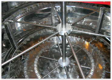 - radialne (promieniste), siła odśrodkowa działa wzdłuż promienia, równolegle do powierzchni plastrów, odwirowywanie odbywa się równocześnie z obydwu stron plastra, kosz tej miodarki może pomieścić do kilkudziesięciu plastrów.