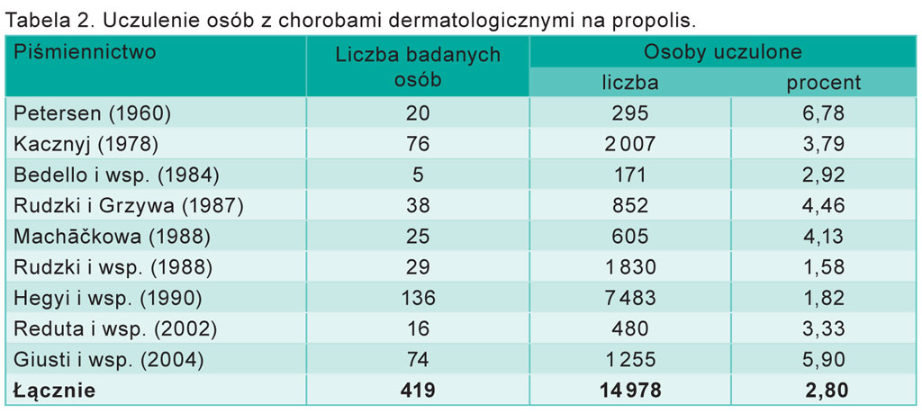 Dane przedstawione w tabeli 2. wskazują, że alergia na propolis u ludzi z chorobami dermatologicznymi występuje znacznie częściej niż u ludzi zdrowych. Z badań Petersena (1960) i Kacznoja (1978), Bedello i wsp. (1984), Rudzkiego i Grzywy (1987), Machāčkowej (1988), Rudzkiego i wsp. (1988), Hegyi i wsp. (1990), Reduty i wsp. (2002) oraz Giusti i wsp. (2004) wynika, że wśród ludzi z chorobami dermatologicznymi jest przeciętnie 2,80% osób uczulonych na propolis. A to oznacza, że wśród 100 osób cierpiących na choroby dermatologiczne, co trzecia osoba równocześnie uczulona jest na propolis.
