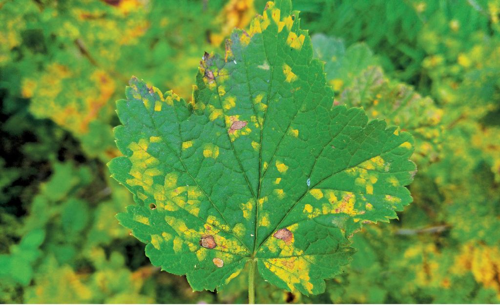 Partea inferioară a frunzei de afin infectată cu rugina de pin - afin. Fot. Rafał Szyrszeń