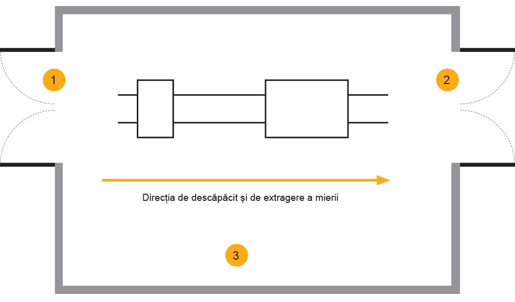 În cazul achiziționării unei linii automate pentru descăpăcirea fagurilor și centrifugarea mierii, aș recomanda pregătirea camerei în așa fel încât ușa și accesul la ea să fie pe ambele părți ale camerei (descărcarea corpurilor pline și încărcare celor goale) sau să dea posibilitatea deplasării mecanice a încărcăturilor folosind chiar și cel mai simplu model de stivuitor.