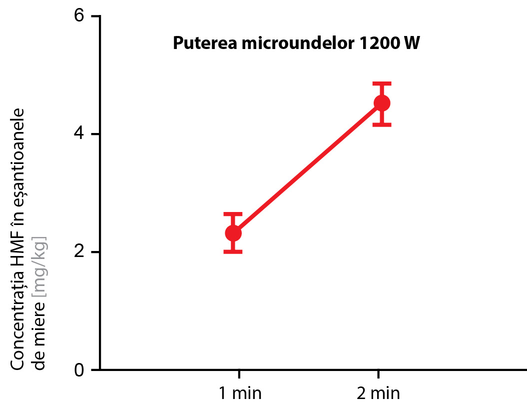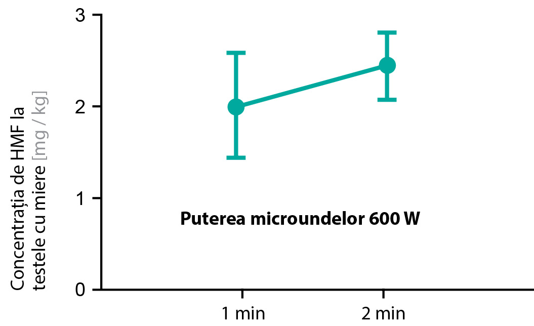 Concentrația de HMF în mierea de tei sub influența radiațiilor cu microunde la 600 W timp de 2 minute a crescut de 1,2 ori comparativ cu expunerea de 1 minut la radiații de aceeași putere. Cu toate acestea, performanța testului t-Student a arătat că aceste modificări nu au fost semnificative statistic.