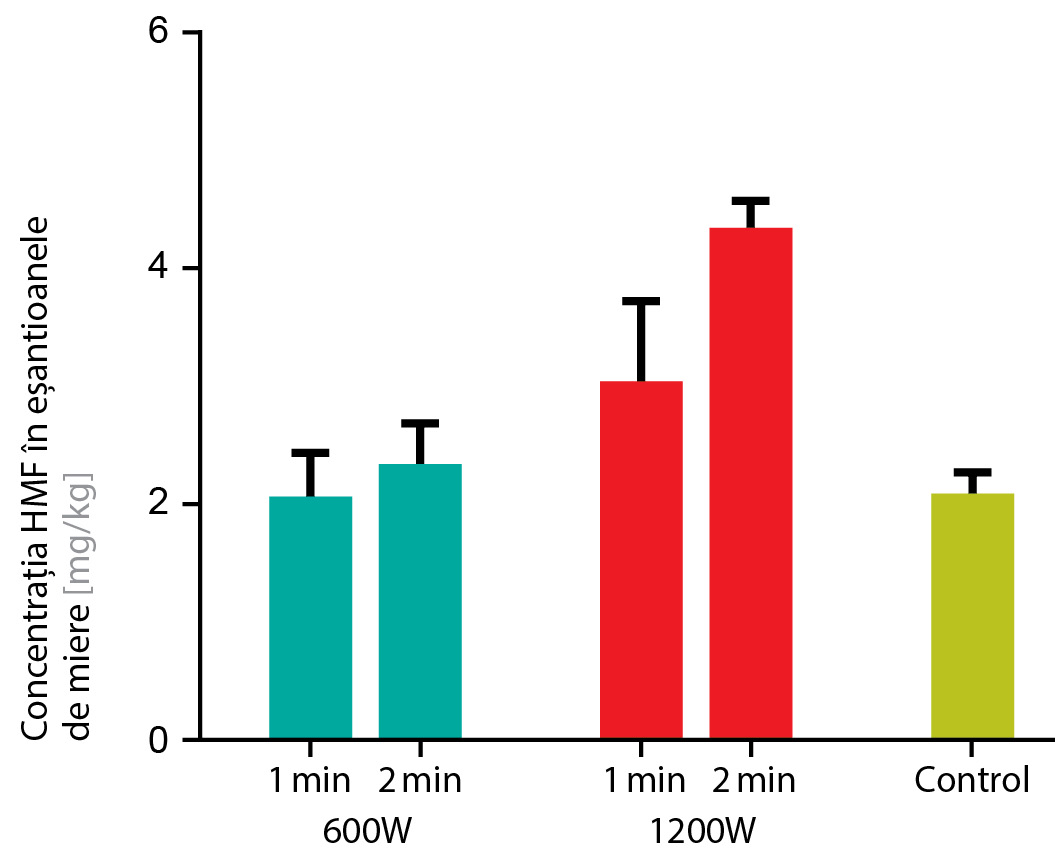 Desenul 4. Analiză comparativă a concentrației medii de HMF în miere de tei după expunerea la microunde. Rezultatele sunt prezentate ca valori medii și abateri standard.