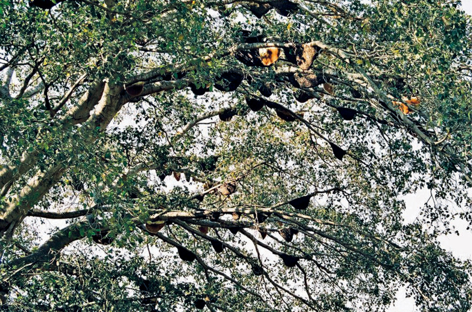 Fotografie 2. Pe smochinul mare din Bengal lângă Bangalor, în India, erau peste 250 de cuiburi de Apis dorsata. Fotografie Prof. J. Woyke