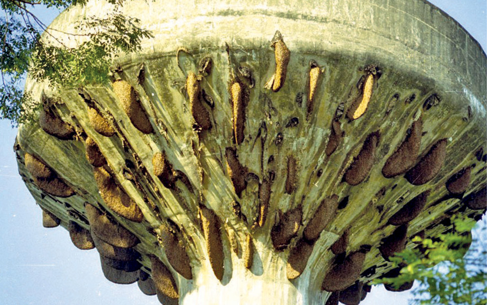 Fotografie 3. Cuibărirea A. dorsata sub fundul rezervorului de apă de pe turnul de apă din Rampor, Nepal. Fotografie Prof. J. Woyke