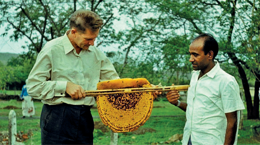 Fotografie 6. prof. J. Woyke cu patch-ul A. dorsata eliminat în Bangalor, India. Fotografie Prof. J. Woyke