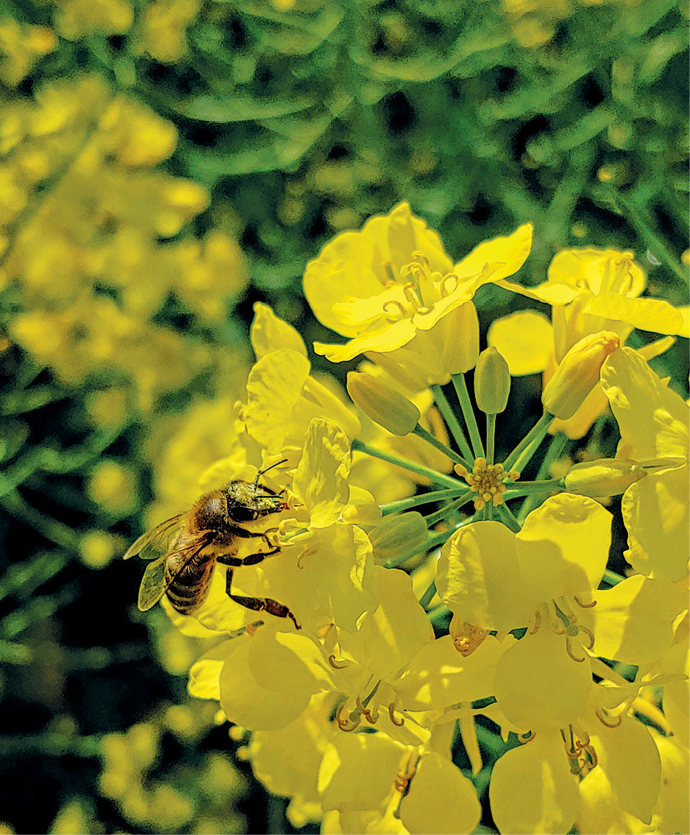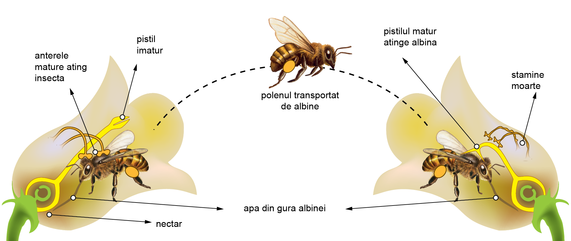 Fotografie 1. În timpul polenizării și colectării nectarului, albinele precipită polenul din anterele mature, care se atașează la firele de păr amplasate pe tot corpul, amestecand astfel polenul și nectarul luat de albine. (Compilat de Roman Dudzik pe baza: Jan Radmoski, Stanisław Tołpa, „Botanică. Manual pentru tehnicieni agricoli”, PWRiL, Varșovia 1971).