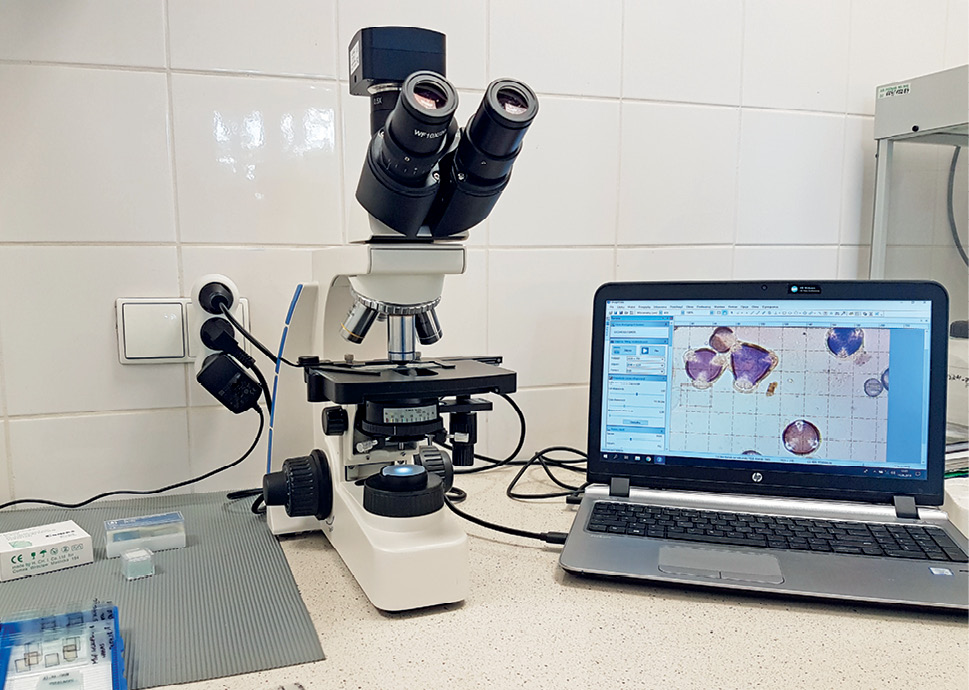 Fotografie 2. Stand pentru analiza polenului. Microscop optic cu cameră și computer cu software de arhivare a imaginilor. Fotografie Marta Burzyńska