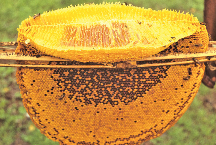 La sfârșitul sezonului, când nu există fertilitate, toate doicile și matca lor abandonează fagurele. La un stup activ, temperatura în interiorul stupului este de 34 ° C. Există puiet în partea inferioară a fagurelui și miere în partea superioară. Acest lucru poate fi văzut pe fagurele unei albine uriașe, prezentat anterior (foto 2.). Culoarea fagurelui, parțial cu roșu, este portocaliu-maroniu. Motivul, este formarea larvei și răspândirea acesteia în interiorul celulei prin etapele succesive ale dezvoltării puietului.