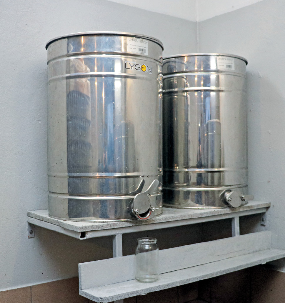 Unul dintre lucrurile care m-au împiedicat de la începutul aventurii mele cu albinele a fost lipsa soluțiilor ergonomice pentru turnarea mierii din recipiente. Unele dintre ele au picioare, dar sunt atât de scurte încât borcanele care urmează să fie umplute pot fi așezate în principiu pe podeaua atelierului. O astfel de muncă este o adevărată tortură pentru mușchii spatelui și coloanei vertebrale. Așa că am luat decizia de a cumpăra maturatoare si rezervoare cu un robinet mare de 2 ”și de a le pune pe masă (foto 2) după propriul meu design.