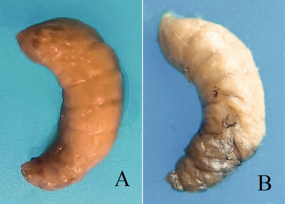 Fotografie 1. Larvele moarte A) îngălbenite, B) partea capului întunecată. Fotografie G. Topolska