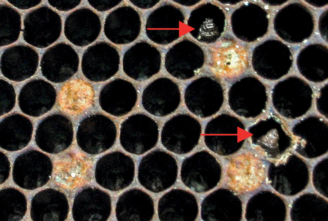 Cu timpul, se întunecă - mai întâi partea capului, apoi restul (foto 9) și se usucă, transformându-se într-o masa în formă de gondolă care poate fi ușor îndepărtată din celulă (foto 10). Puietul are un aspect explodat (foto 11), iar depozitele sunt perforate de albine care încearcă să îndepărteze larvele moarte din cuib.