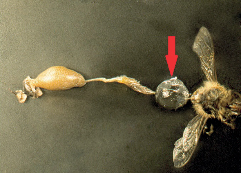 Fotografie 5. Tractul digestiv și trunchiul albinei. Săgeata arată spre gușa de miere întinsă. Aripile întinse sunt, de asemenea, vizibile. Fotografie G. Topolska