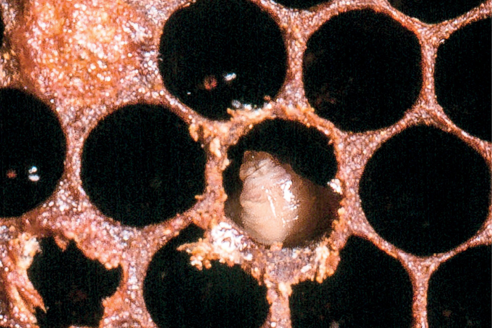 Fotografie 11. Larva împușcata. Larve moarte vizibile cu capul ridicat în mod caracteristic și o gaură în celulele cu capac. Fotografie G. Topolska