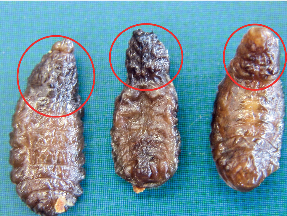 Fotografie 2. Pupele moarte A) aspect aproape normal, B) îngălbenite, C) corpul din față întunecat. Fotografie G. Topolska