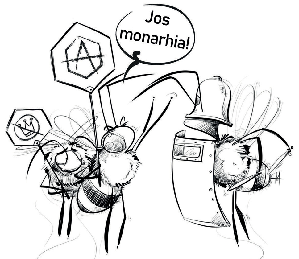 JJ: Din câte știu, în biologia albinelor există trei strategii diferite, să spunem nonconformiste, pentru comportamentul lucratoarelor față de o întreagă colonie de albine, adică anarhist, rebel și bezmetice. In ce fel sunt ei diferiti?