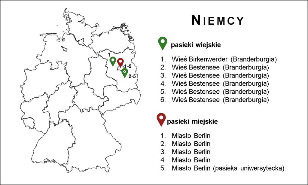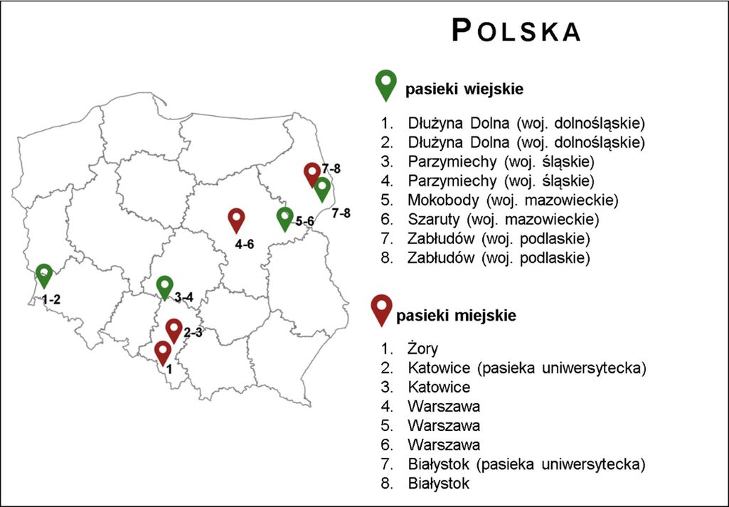Analizie poddano próbki miodów z 35 pasiek: 15 miejskich i 18 wiejskich. Wśród pasiek miejskich znajdowały się pasieki z: Polski (woj. podlaskiego, m. Białystok – 2 pasieki; woj. śląskie, m. Katowice i m. Żory – 3 pasieki; woj. mazowieckiego, m. Warszawa – 3 pasieki) oraz Słowenii (1 pasieka z m. Ljubljana), Niemiec (5 pasiek z m. Berlin) i USA (1 pasieka z m. Georgia). Miód z pasiek tradycyjnych pochodził z: Polski (woj. śląskie – 2 pasieki; woj. dolnośląskie – 2 pasieki; woj. mazowieckie – 3 pasieki, woj. podlaskie – 2 pasieki), Słowenii (1 pasieka), Niemiec (5 pasiek z Bestensee, 1 z Birkenwerder, 1 z Rheinsberg) oraz z Chin i Wietnamu (1 próbka, miód zakupiony w sklepie). Jako kontrolę pozytywną dla analiz biochemicznych i mikrobiologicznych wykorzystano miód manuka MGO 400+ (min. 40 g MGO/100 g miodu, Nowa Zelandia). Kontrolą negatywną w badaniach był sztuczny miód (skład: cukier 79%, woda, syrop skrobiowy, kwas cytrynowy, aromat miodowy). Naukowcy skupili się na ich właściwościach biochemicznych, antyoksydacyjnych i przeciwdrobnoustrojowych. Analizowano również zanieczyszczenie miodu mikroplastikiem.