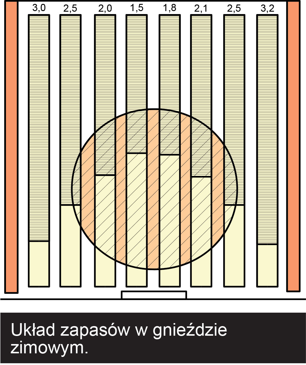 Jako skrajne dajemy plastry z zapasem, który pszczoły mają nagromadzony przeważnie właśnie na ramkach będących tuż przy ścianach ula. Jak ułożyć gniazdo, by było ono dostosowane do siły zimującej rodziny, gdy końcem sierpnia czy na początku września mamy w ulu tyle pszczół, że obsiadają one np. 20 ramek wielkopolskich na czarno, z czego 10 jest gniazdowych a 10 to jeszcze miodnia?