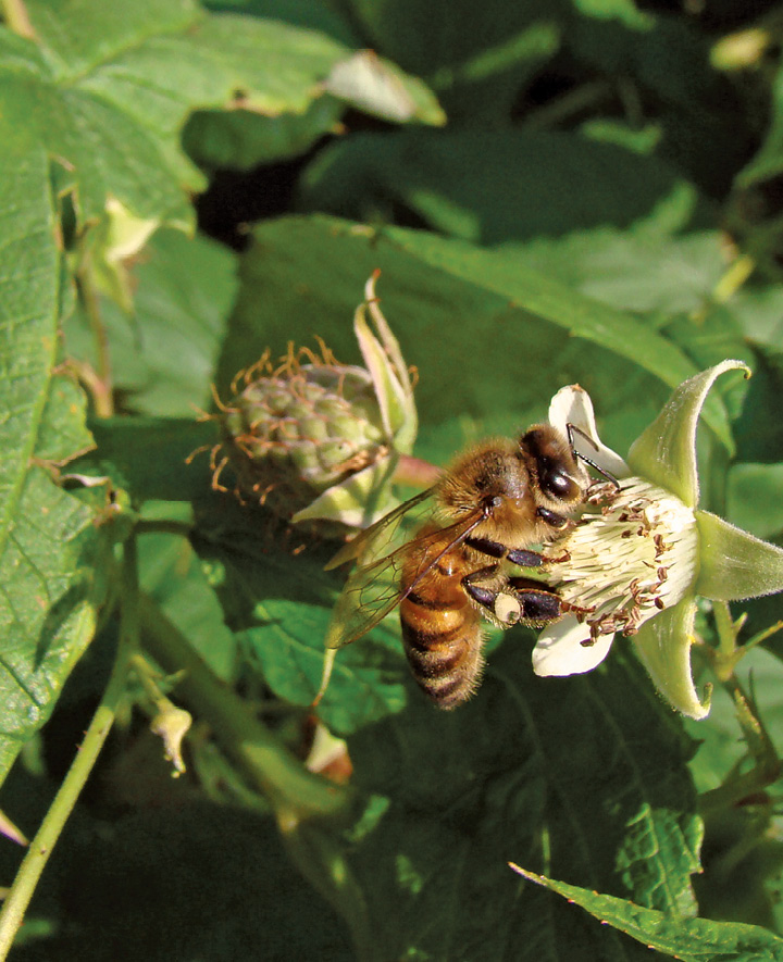 Kwiaty dostarczają nektaru oraz pyłku. Są bardzo chętnie odwiedzane przez pszczoły od godzin rannych (7:00) do wieczornych (19:00). W Europie północnej malina stanowi ważne źródło pokarmu dla tej grupy owadów. Nektarowanie gatunku jest bardzo obfite – do wypełnienia wola zbieraczka potrzebuje odwiedzić zaledwie 3–5 kwiatów. Pojedynczy kwiat wydziela w ciągu życia 20–38 mg nektaru o koncentracji 30–50%, co po przeliczeniu na masę cukrów stanowi 2-15 mg. W nektarze nie występuje (bądź w niewielkim stężeniu) sacharoza. Wydajność miodową oszacowano na 100-170 kg/ha, a przy dobrych warunkach klimatyczno-glebowych nawet ponad 240 kg/ha. Dzienny przyrost ula na wadze może wynosić 5-15 kg. Wywóz pszczół w pobliże plantacji malin pozwala uzyskać miód towarowy. Cechuje się on delikatnym i przyjemnym zapachem, w stanie płynnym jest jasny, po krystalizacji (która następuje dosyć szybko) prawie biały. Pyłek najintesywniej uwalniany jest z kwiatów w godzinach 8:00–10:00, między 10:00 a 12:00 obserwuje się spadek intensywności tego procesu, po czym następuje lekki jego wzrost do godziny 16:00, a wkrótce po 18:00 kończy się. Wypylenie kwiatu następuje średnio w ciągu 36 godzin. Pogorszenie się pogody może przedłużyć ten proces lub całkowicie go zahamować. Jeden kwiat (w zależności od odmiany) produkuje 0,6-3,6 mg pyłku, który zawiera 15-37% białka. Wydajność pyłkowa wynosi 3,5-20 kg/ha. Do dobrego zapylenia 4-5-letniej plantacji malin potrzeba około 3 rodzin pszczelich.