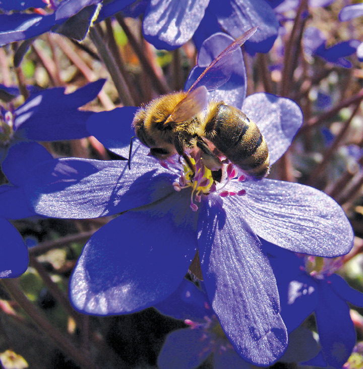 Pszczoły najliczniej odwiedzają kwiaty przylaszczki w środkowej części dnia (między 11:00 a 13:00), gdy najwięcej pręcików pyli.