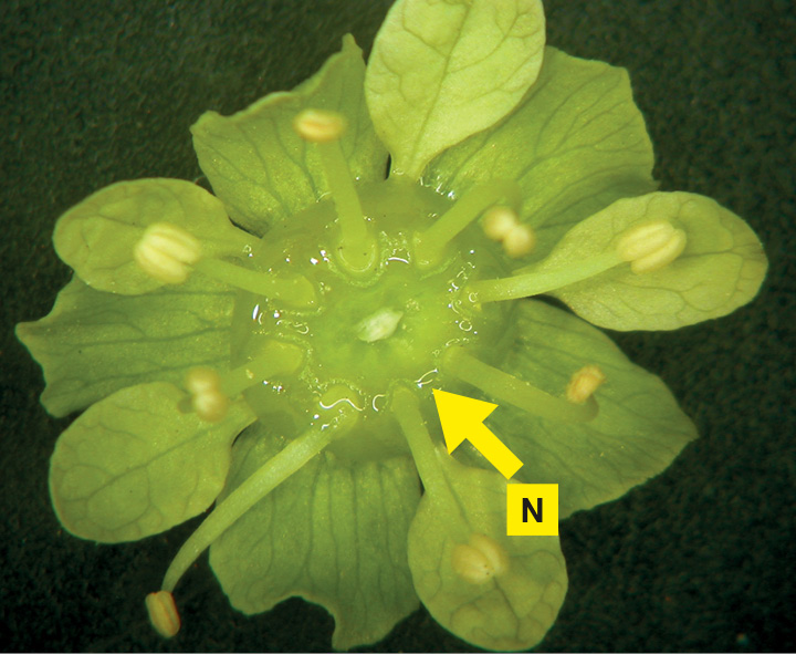 Nektar jest słodkim roztworem, na który składa się głównie woda (30-90%) i cukry (zwł. glukoza, fruktoza i sacharoza, które u różnych gatunków roślin występują w różnych proporcjach), a także metabolity pierwotne (aminokwasy, białka, tłuszcze, kwasy organiczne), sole mineralne, barwniki, witaminy i metabolity wtórne (związki fenolowe, alkaloidy, glikozydy, terpenoidy, flawonoidy). Nektar produkowany jest przez tkankę wydzielniczą nazywaną nektarnikiem. Nektarniki różnią się wielkością, kształtem i budową. Są usytuowane w różnych miejscach w kwiecie, np. u jabłoni wyścielają dno wklęsłego dna kwiatowego, u rzepaku znajdują się u podstawy pręcików, u lipy zlokalizowane są na wewnętrznej powierzchni działek kielicha, a u nawłoci tworzą pierścień nad zalążnią u podstawy szyjki słupka.