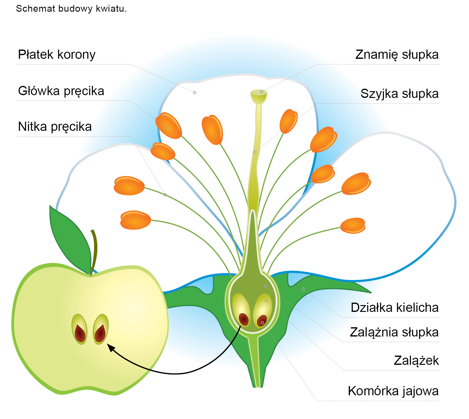 Kwiat roślin okrytozalążkowych jest zmodyfikowanym, skróconym pędem (którego liście zastały przekształcone w odpowiednie elementy kwiatu). Zazwyczaj osadzony jest na łodyżce nazywanej szypułką (= osią kwiatu), bądź może być siedzący (bez szypułki). Kwiaty cechuje różna wielkość, symetria oraz mnogość kształtów np. kwiaty wargowe (np. szałwii), motylkowe (np. karagany), lejkowate (np. różanecznika), dzwonkowate (np. facelii). Typowy kwiat zbudowany jest z okwiatu oraz elementów generatywnych (pręcików i słupka/ów) wyrastających ze wspólnego dna kwiatowego. Okwiat stanowi ochronę dla elementów generatywnych (biorących bezpośredni udział w rozmnażaniu) kwiatu, jak również pełni funkcję zwabiania zapylaczy. U roślin jednoliściennych (np. szafirek, tulipan) okwiat jest pojedynczy (niezróżnicowany), tzn. wszystkie jego elementy (nazywane listkami okwiatu) są morfologicznie podobne, natomiast u roślin dwuliściennych (np. gorczyca) ulega zróżnicowaniu na zewnętrzny kielich i wewnętrzną koronę. Kielich utworzony jest z działek przypominających małe listki, które mogą być wolne lub zrośnięte. Najczęściej cechuje go zielona barwa, czasem może mieć także inny kolor np. bordowy u kuklika zwisłego. U niektórych gatunków (np. u pelargonii) występuje dodatkowy okółek działek kielicha nazywany kieliszkiem. Korona utworzona jest z wolnych lub zrośniętych płatków charakteryzujących się różnorodną feerią barw, począwszy od białej, poprzez żółtą i pomarańczową, fioletową, czerwoną, niebieską do niemal czarnej. Ma to niebagatelne znaczenie dla zbieraczek pszczoły miodnej, zważywszy na ich percepcję widma słonecznego w zakresie promieni o długości fal 310-650 nm. Co ciekawe, pszczoły miodne mając do dyspozycji różne kolory kwiatów, najchętniej odwiedzają te o barwie niebieskiej i żółtej. Kwiaty niektórych roślin nie posiadają okwiatu (np. leszczyna pospolita), co najczęściej jest związane z przystosowaniem do zapylania ich przez wiatr. Elementami generatywnymi kwiatu są pręciki i słupki. Pręcik to męski organ rozrodczy utworzony z nitki (najczęściej wydłużonej) i osadzonej na jej szczycie główki, którą stanowią dwa pylniki połączone łącznikiem. Każdy pylnik utworzony jest z dwóch woreczków pyłkowych, w których powstają ziarna pyłku. Sumę wszystkich pręcików w kwiecie nazywa się pręcikowiem. Słupek (gdy w kwiecie jest więcej słupków określa się je terminem słupkowie) jest żeńskim organem rozrodczym utworzonym z dolnej, zwykle rozszerzonej zalążni oraz szyjki (często wydłużonej) zakończonej znamieniem. Po procesie zapylenia i zapłodnienia, zalążnia (czasem może to być także inna część kwiatu) przekształca się w owoc, a zalążki (lub zalążek) osadzone wewnątrz zalążni, tworzą nasiona (lub nasiono).