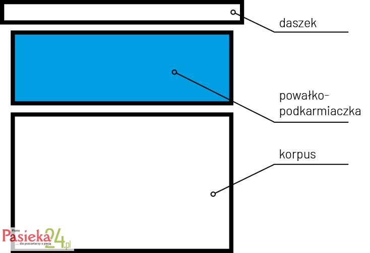 Powałko-podkarmiaczki, inaczej nazywane korpusowymi, stanowią jeden zintegrowany element o dwóch funkcjach. Ich nazwa oddaje sens konstrukcji – to zarówno powałki, jak i podkarmiaczki. Stanowią dodatkowy korpus ula i nie wymagają dokupywania dodatkowych elementów. W ulach, gdzie nie pozyskuje się propolisu za pomocą górnych poławiaczy, elementy te pozostają przez cały rok. Mają one największe pojemności spośród pozostałych podkarmiaczek, przekraczające 10 l. To bardzo podnosi efektywność karmienia pszczół na zimę poprzez minimalizację liczby wizyt na pasieczysku. Konstrukcja otworów wentylacyjnych, którymi przemieszczają się pszczoły po pokarm, uniemożliwia ich kitowanie. To zaleta i wada jednocześnie: wydatny przepływ gazu ułatwia wentylację wnętrz uli latem czy podczas transportu, umożliwia też szybkie odparowanie wody z syropu. Wiosną jednak pogarsza termikę w gniazdach, spowalniając nieco wiosenny rozwój. Powałko-podkarmiaczki w codziennej praktyce są szybkie w użyciu, podobnie jak podkarmiaczki powałkowe. Uchyla się daszek i wlewa potrzebną ilość syropu. Przy korzystaniu z mechanicznych rozwiązań w zakresie aplikowania paszy (pompy), zadanie 10 l syropu w przeliczeniu na 1 ul nie powinno trwać dłużej niż 45 sekund. A zatem w ciągu jednej godziny można zadać paszę wszystkim rodzinom na wcale niemałym pasieczysku. Owady bardzo chętnie i szybko pobierają paszę zarówno z podkarmiaczek powałkowych, jak i powałko-podkarmiaczek, o ile są zdrowe, a ich siła nie jest bardzo mała. W oba typy można podawać pokarmy płynne, a niektóre modele oferują także opcję stosowania ciast.