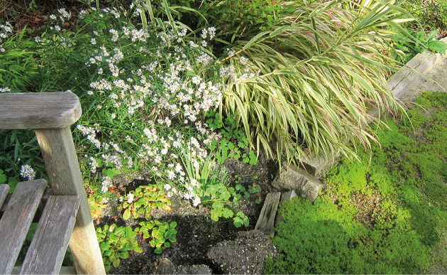 babka średnia Plantago media, czyściec wełnisty Stachys byzantina, jastrzębiec kosmaczek Hieracium pilosella, komonica zwyczajna Lotus corniculatus, koniczyna polna Trifolium arvense, macierzanka omszona Thymus lanuginosus, macierzanka piaskowa T. serpyllum, rozchodnik ostry Sedum acre, rozchodnik sześciorzędowy S. sexangulare, smagliczka skalna Aurinia saxatilis, (rogownica kutnerowata Cerastium tomentosum, rdest ptasi Polygonum aviculare).
