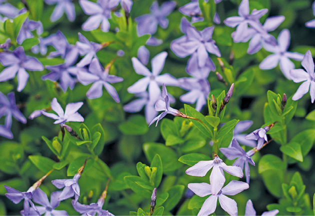 Barwinek pospolity doskonale pełni funkcję trawnika (po prawej).