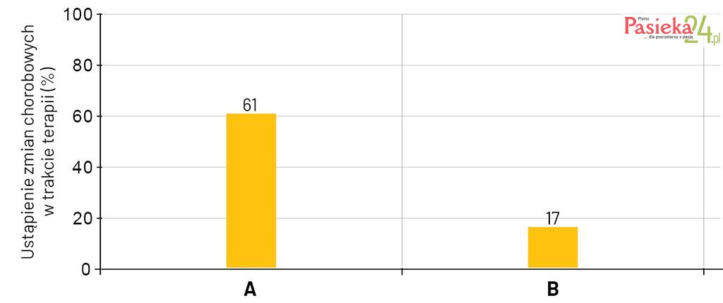 Innym przykładem kosmeceutycznym jest maść przeznaczona do leczenia atopowego zapalenia skóry [16]. Preparat składa się z wosku pszczelego żółtego, miodu pszczelego i oliwy z oliwek (1 : 1 : 1). Badania kliniczne obejmowały 20 dzieci w wieku 5–16 lat podzielonych na 2 równe grupy. Jedną grupę leczono mazidłem woskowo-miodowo-olejowym, drugą (kontrolną) – wazeliną. Preparaty stosowano 3 razy dziennie przez 3 tygodnie. Efekty leczenia oceniano punktowo. Stwierdzono, że u pacjentów leczonych mazidłem woskowo-miodowo-olejowym objawy chorobowe zmniejszyły się o 61%, podczas gdy w grupie kontrolnej tylko o 17% (Ilustr. 25).