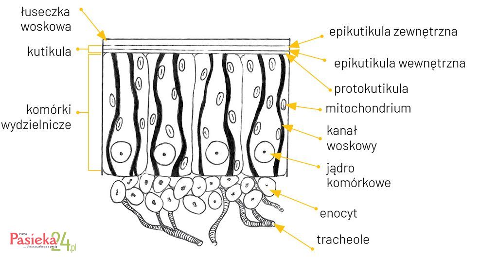 Uważa się, że enocyty są głównym dostawcą niezbędnych do powstawania wosku węglowodorów i kwasów tłuszczowych, natomiast trofocyty dostarczają głównych składników tego produktu, a mianowicie estrów kwasów tłuszczowych. W systemie licznych kanalików dochodzi przypuszczalnie do ostatecznej syntezy wosku. W płynnej postaci jest on następnie dostarczany na powierzchnię lusterek woskowych.