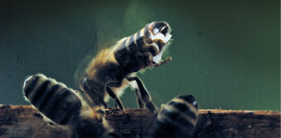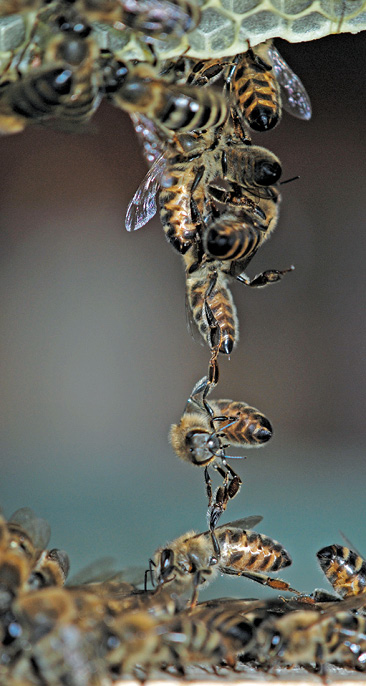 Pszczoły robotnice (woszczarki) wydzielają wosk dzięki pracy zespołu pszczół, które łączą się ze sobą w kierunku od górnej przestrzeni gniazda do dolnej (Fot. 12). W ten sposób pszczoły woszczarki tworzą wieloogniwowe wiszące łańcuchy, w obrębie których tracą mniej ciepła. Prowadzi to do podwyższenia temperatury ciała pszczół i oddania ciepła do otoczenia, a także ogrzania plastrów z zapasem. Jednak woszczarki nie zawsze tworzą łańcuchy – bywa, że wypacają wosk, stojąc i podnosząc odwłok.