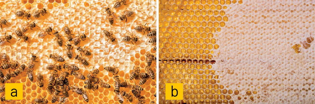Kolejną ważną funkcją wosku w rodzinie pszczelej jest zasklepianie przez pszczoły komórek plastra, w których znajduje się miód (Fot. 5) lub czerw (Fot. 6). Zasklepianie plastrów z miodem często nazywane jest poszywaniem komórek.